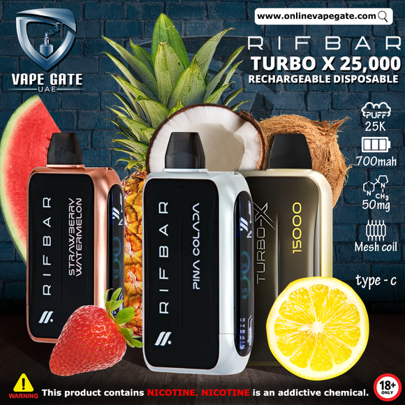 Rifbar Turbo X Rechargeable Disposable Vape (25,000 Puffs) is available in the best vape shop in Dubai to order vape Online from Vape Gate UAE with the Same Day vape Delivery service in Dubai, Abu Dhabi, Al Ain, Ras Al Khaimah, Ajman, Sharjah, Ruwais.