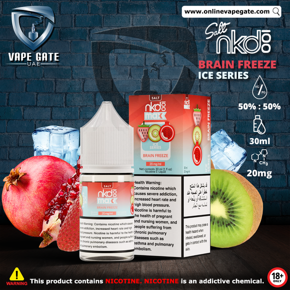 Naked 100 Max - Brain Freeze Saltnic 30ml is refreshing on a whole new level, featuring perfectly ripe fruity Strawberries and crisp Kiwi, backed with subtle yet complex Ruby Red Pomegranate essence, all served ice cold.Â