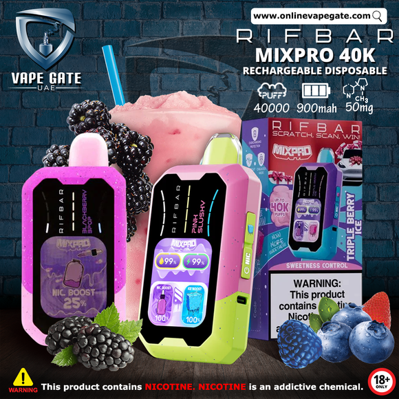 Rifbar Mixpro 40K Rechargeable Disposable Vape (40,000 Puffs) is available in the best vape shop in Dubai to order vape Online from Vape Gate UAE with the Same Day vape Delivery service in Dubai, Abu Dhabi, Al Ain, Ras Al Khaimah, Ajman, Sharjah, Ruwais.