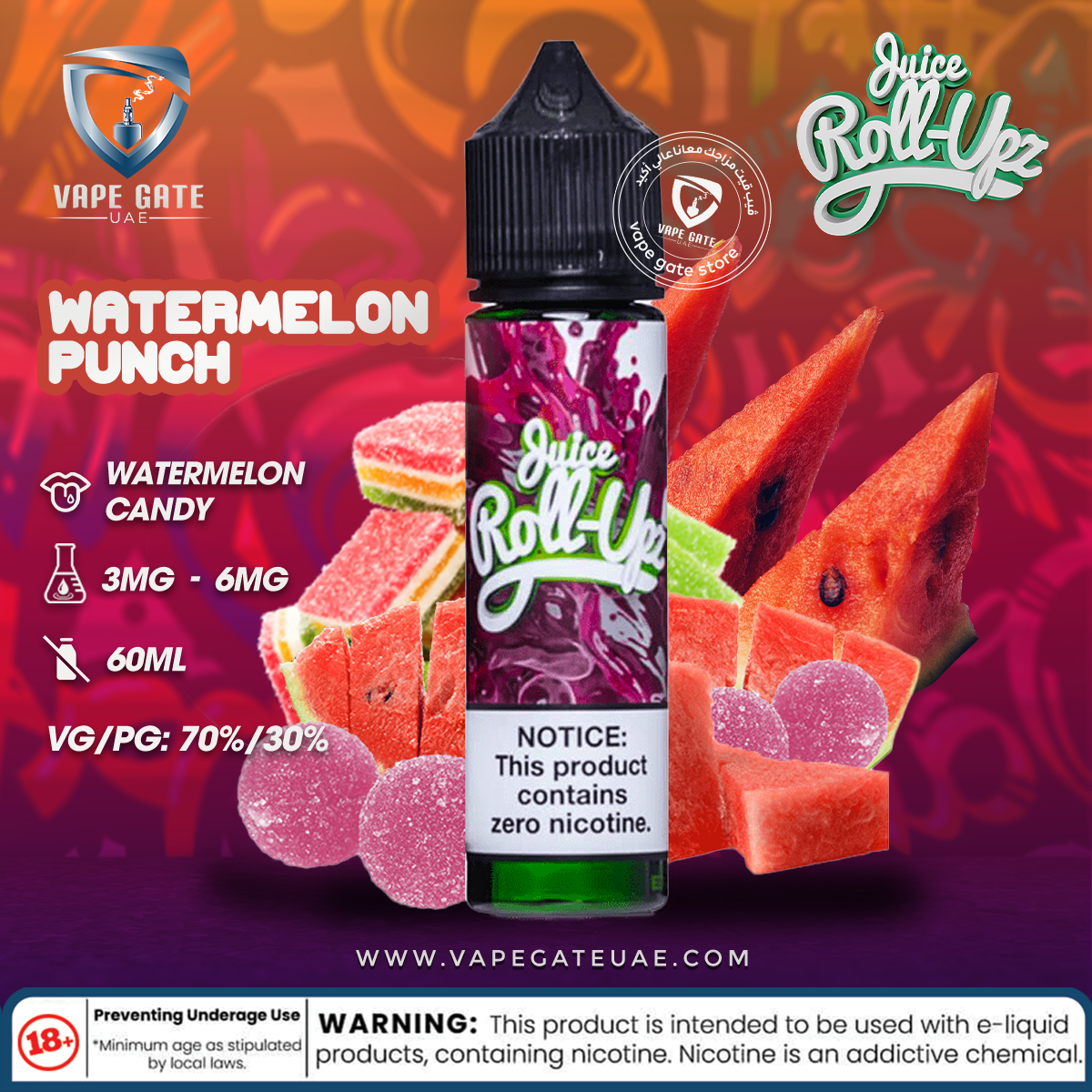 Watermelon Punch ejuice by Juice roll upz is one of five fruity candy flavors from Juice Roll Upz. A refreshing burst of sweet watermelon juice with just the right amount of tangy after kick. Candy lovers who look for a more substantial flavor base won't be disappointed with this consistent, full flavored caddied eliquid.