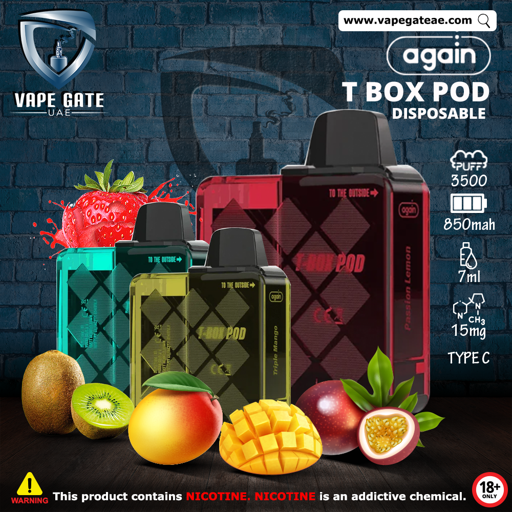 AGAIN T-Box Pod Kit Disposable Vape is available to order Online from Vape Gate UAE with a unique same-day delivery service in UAE, Abu Dhabi, Dubai, Al Ain, Ras Al Khaimah, Ajman, Sharjah, Ruwais.