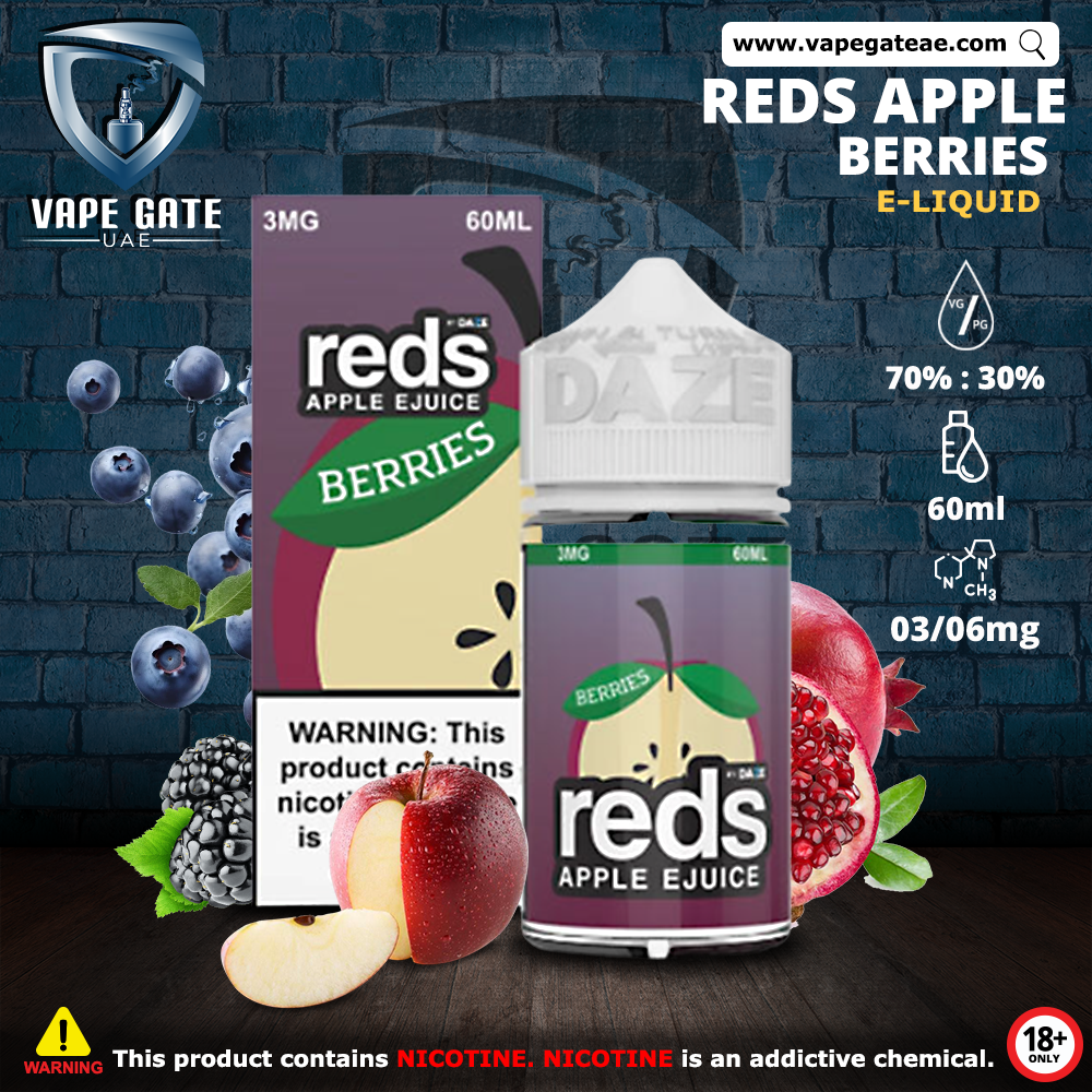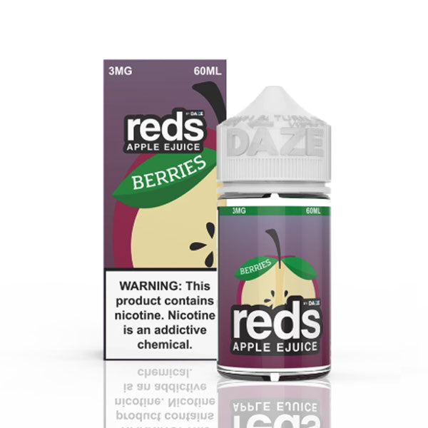 7 Daze Reds Apple Reds Berries E-Liquid is refreshing cold glass of apple juice blended with fresh blueberries and ripe raspberries, with a hint of juicy pomegranate.