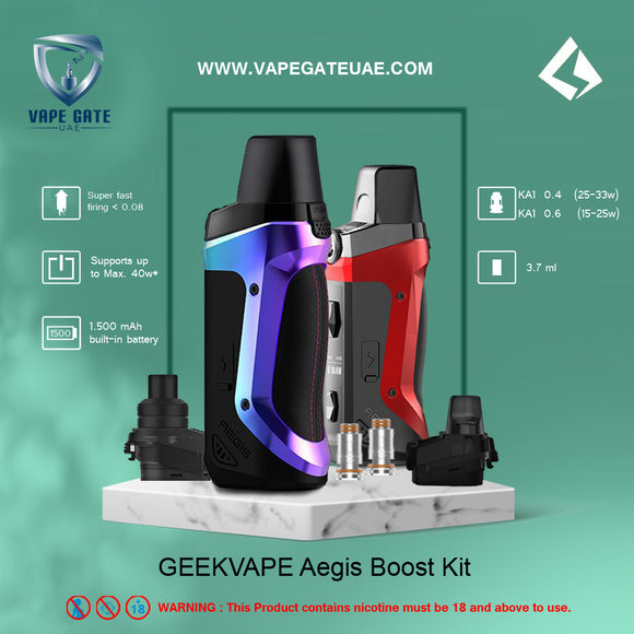 Shop the New Geekvape Aegis Boost Vape Pod Mod Kit powered by the AS chip, Guaranteeing the stability and ease of use of the vaping for you with functions of IP67 waterproof, shockproof and dustproof. Integrating built-in 1500mAh battery, max power 40W output, the Geekvape Aegis Boost Vape Pod Mod Kit allows you to immerse into a content vaping without worrying about the low battery. The paired pod contributes to enhancing continuous and fine vaping with a decent 3.7ml juice capacity and mesh coil. 5 colors available.