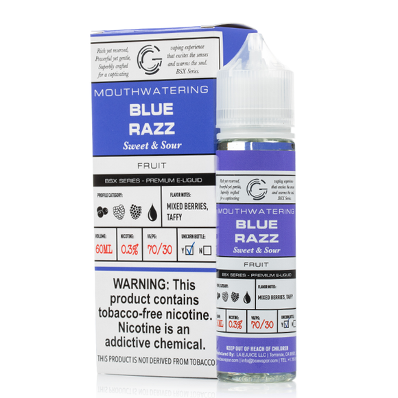 Basix Series - Blue Razz by Glas Vapor, featuring a tangy blue raspberry blend with a slight touch of creaminess to balance the flavor.