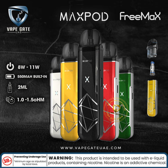 Freemax Maxpod Kit 550mAh available to order Online from Vape Gate UAE with a unique Delivery service in UAE, Abu Dhabi, Dubai, Al Ain, Ras Al Khaimah, Ajman, Sharjah, Ruwais Â