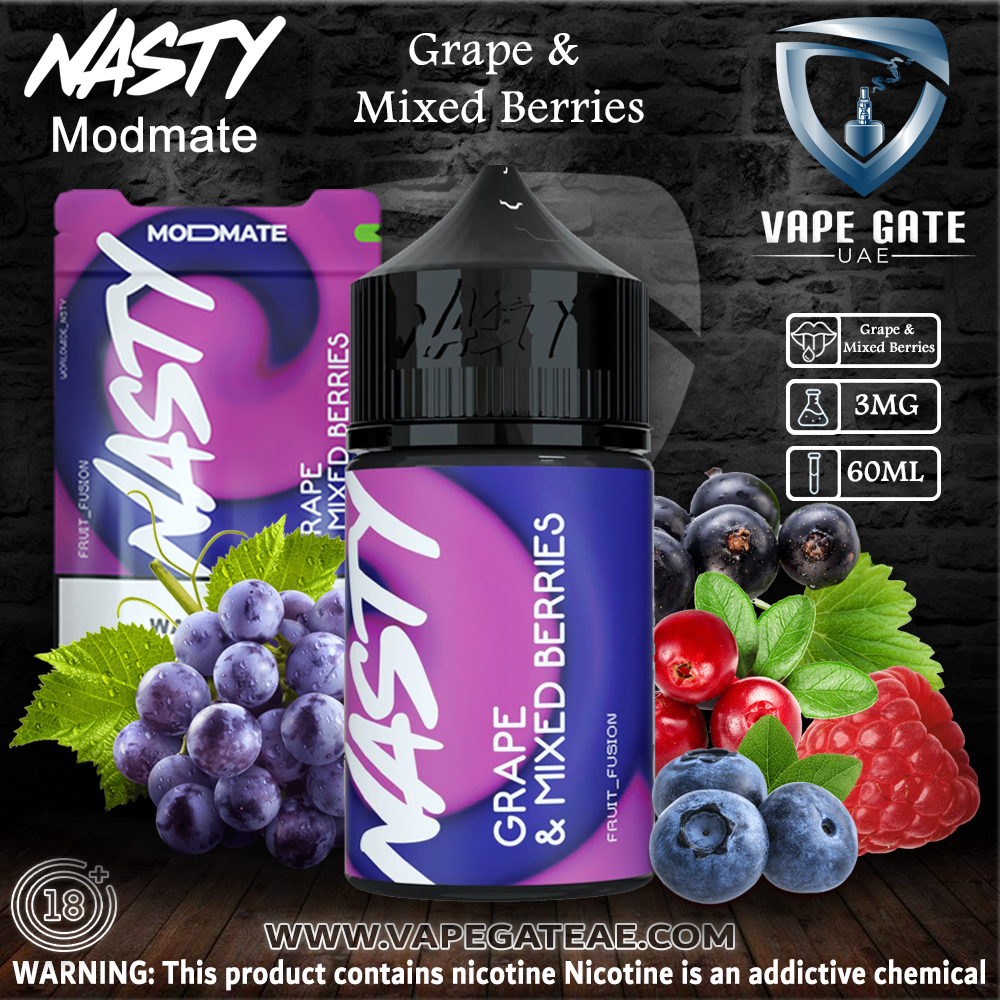 Grape And Mixed Berries Nasty Modmate 60ml is Mixed berry flavors are expertly blended with the sweet taste of fresh off-the-vine grapes to create an unforgettable e-liquid that your palate will never forget. Taste the one-of-a-kind Grape Berry Mix today and satisfy your taste buds. This vape blend tastes Grape flavors that are steeped in freshly squeezed berry punch, to reinvent and twist the way you see the spectrum of flavor. Dive into the exciting world of berries that await you in Grape Berry Mix.