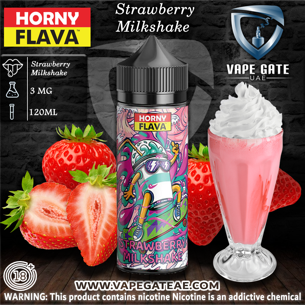 Horny - Strawberry Milkshake 120ml E Liquid by Horny Flava available to order Online from Vape Gate UAE with a unique Delivery service in UAE, Abu Dhabi, Dubai, Al Ain, Ras Al Khaimah, Ajman, Sharjah, Ruwais