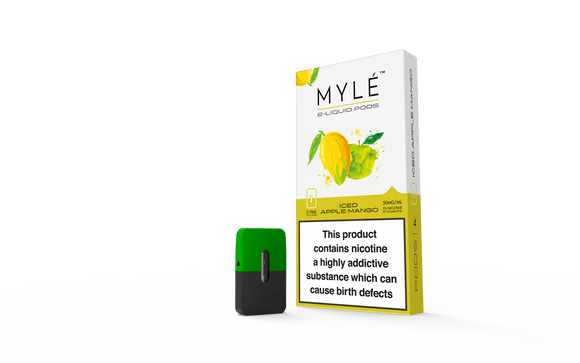 Get some amazement and cooling with disposable Myle Iced Apple Mango  pods brought to you by MYLE Vapor. These nicotine salt infused pre-filled pods contain harmonious flavoring of sour apples and sweetest mangoes with menthol finish.