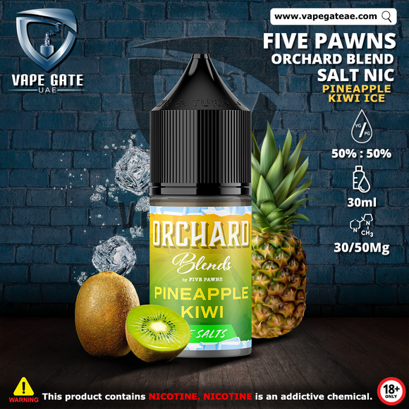 Whether you are looking for PINEAPPLE KIWI ICE - ORCHARD BLEND FRUIT SALTNIC BY FIVE PAWNS California here at Vape Gate UAE the best vape shop in Dubai, we can Provide you with a massive collection of E liquid and Saltnic for the Same Day Vape Delivery to Dubai, Abudhabi and Next Day vape Delivery to Sharjah, Fujairah Ajman, Ras Al Khaimah, Al Ain & Ruwais. with best vape price in Dubai.
