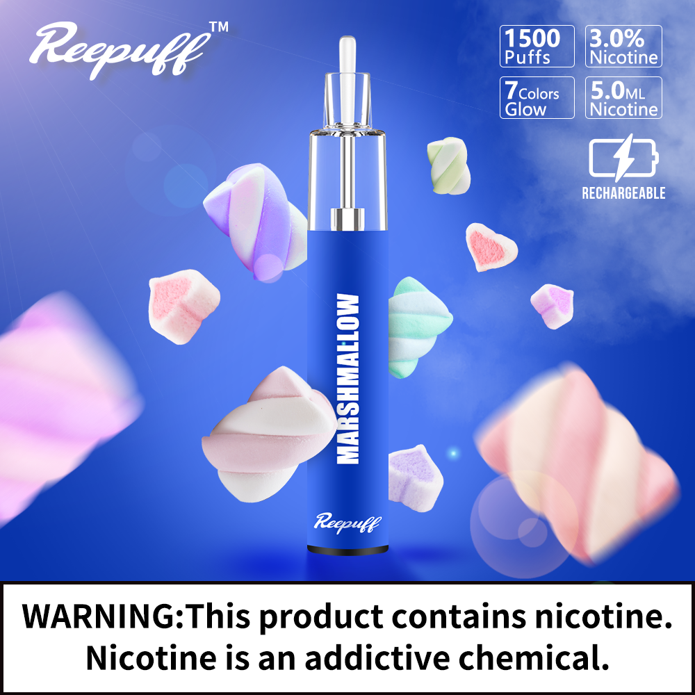 The tank holds 5ml of e-liquid and it's lasting to about 1500 puffs. This is enough to allow you to vaping for as long as you want. The coil resistance is 1.0ohm and is designed to replicate the smoking sensation. In addition, the Reepuff Glow integrated tank has a unique pull & play mechanism, which can provide real taste and safety the guarantee for the internal e-liquid. The ergonomic mouthpiece is comfortable to vape on and a completely transparent design allows you to check the current e-juice consumption at any time. Also, It lights up like a glowstick in 7 different colors, it is really fashioned, Reepuff Glow gives a satisfying vaping experience that closely replicates the feeling of inhaling a cigarette.